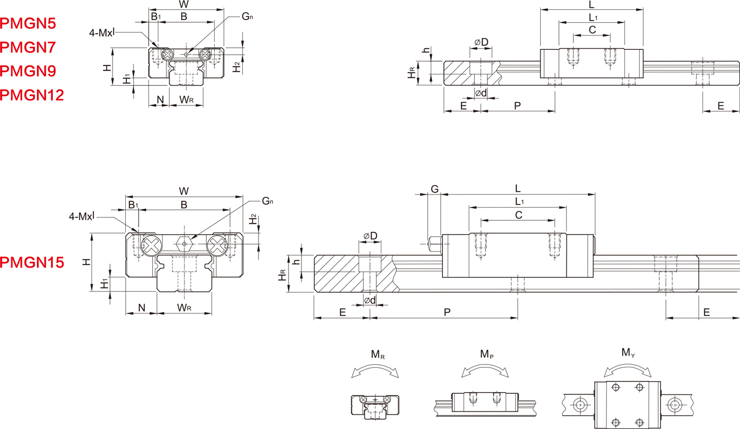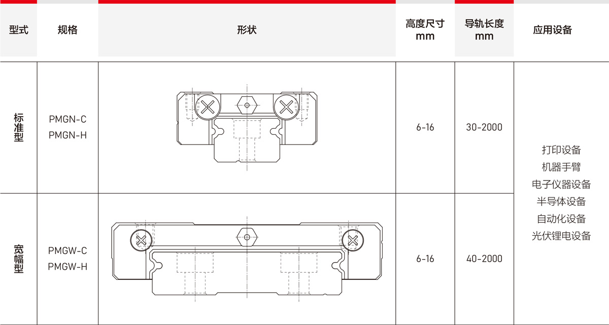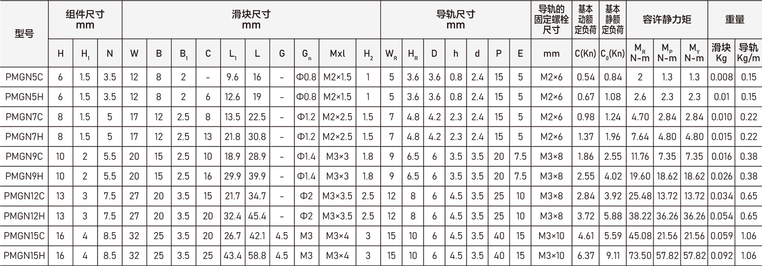 PMGN及PMGW系列小型导轨的精度,分为普通、高、精密级共三级,客户可依设备精度需求选用适合精度。