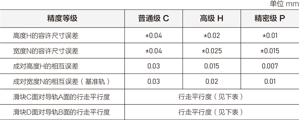 滑块C面对导轨A面、滑块D面对导轨B面的行走平行度与导轨精度、长度有关,其值列于下表。