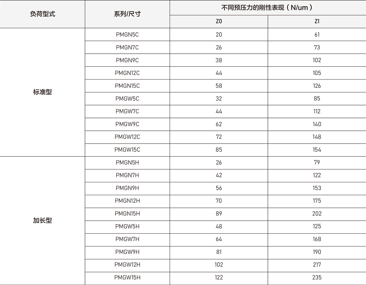 不同的预压力呈现不一样的滑块刚性,上表为各尺寸的滑块刚性值。
