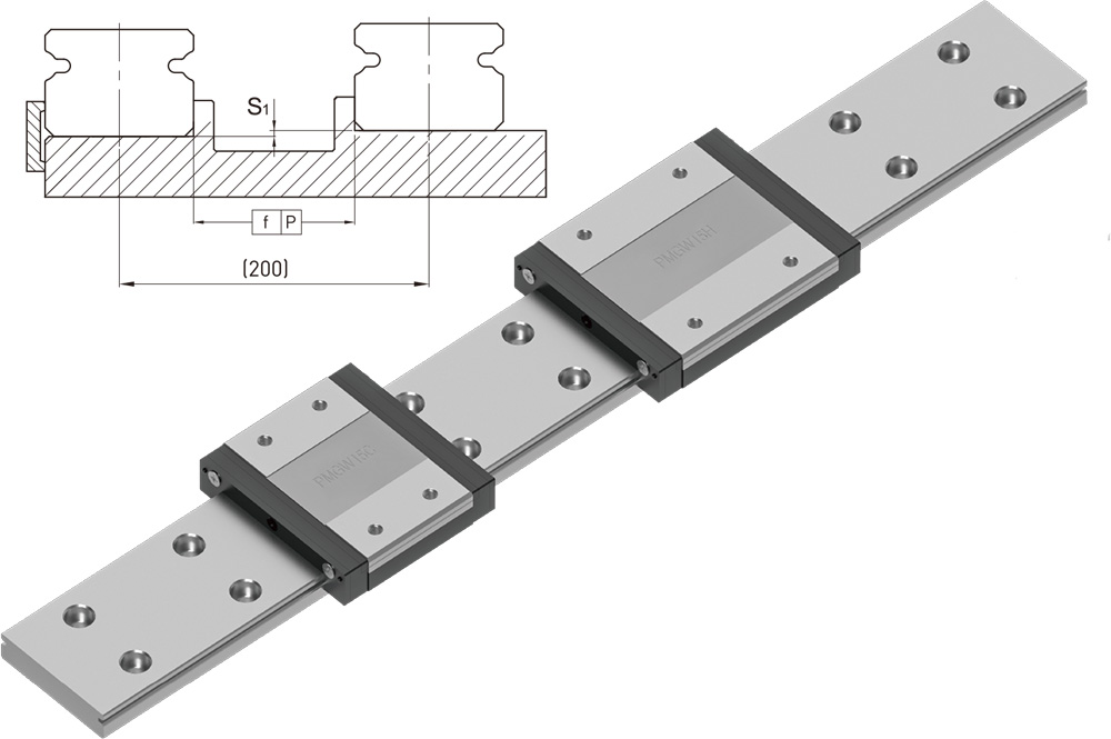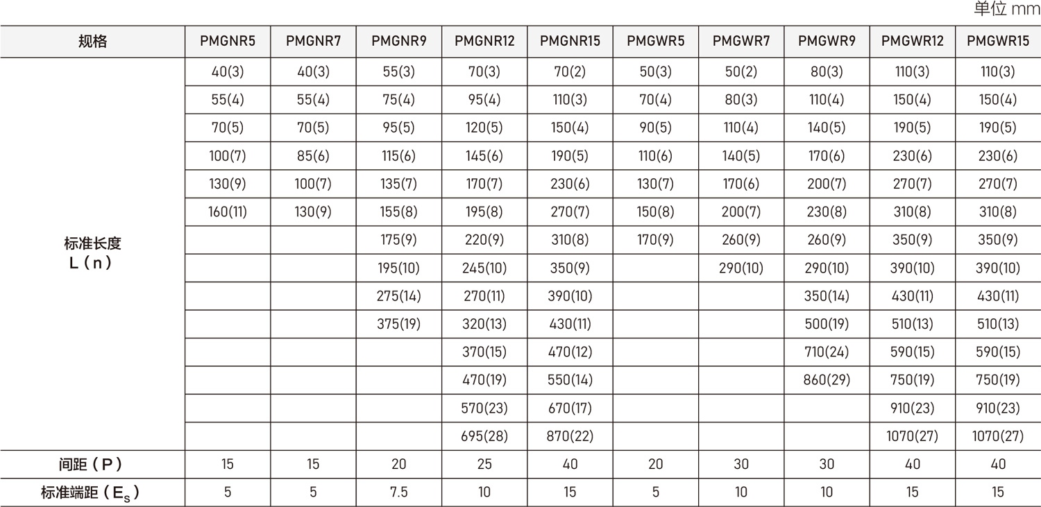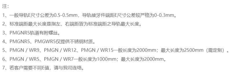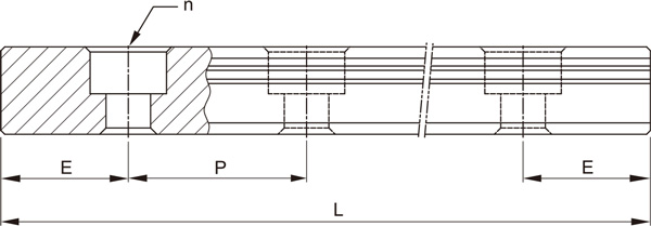 备有导轨标准长度库存,以供应客户需求。若客户订购非标准长度导轨时,端面距离E的尺寸,最好不要大于1/2P,防止因E的尺寸过大,导致导轨装配后端部的不稳定,而降低直线导轨的精度,亦不可取用过小的E值(小于Emin)以避免螺栓孔/螺丝孔破孔。