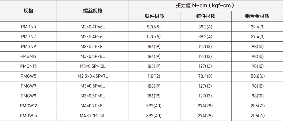 安装导轨时是否锁紧贴平基准面影响直线导轨精度甚剧,因此为达到每颗螺丝都能锁紧的目的,建议使用下列扭力值锁装配螺丝。